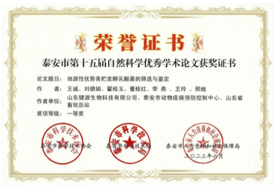 為深入推進泰安市“科創中國”試點市建設,培養人才,繁榮學術,鼓勵創新,提升泰安市廣大科技工作者的學術水平,根據泰安市人才工作計劃,由泰安市科協、泰安市科技局、泰安市人社局在全市組織開展了泰安市第十五屆自然科學優秀學術論文評選活動。本次評選堅持公開、公平、公正的原則,采用異地評委評選的方式進行,共評出一等獎42項;二等獎70項;三等獎82項。山東健源生物科技有限公司《地源性優勢青貯發酵乳酸菌的篩選與鑒定》項目榮獲泰安市第十五屆自然科學優秀學術論文一等獎。