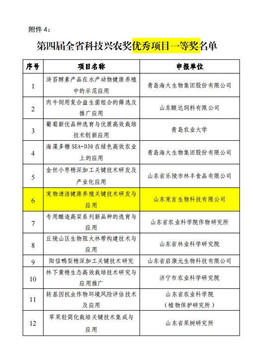 山東健源生物科技有限公司申報的《一種微生物秸稈發(fā)酵劑及其發(fā)酵秸稈的方法》項目獲得山東省農(nóng)業(yè)科技轉(zhuǎn)化促進會科技興農(nóng)獎優(yōu)秀項目獎專利獎。健源生物旗下子公司山東寵言生物科技有限公司申報的《寵物清潔健康養(yǎng)殖關(guān)鍵技術(shù)研發(fā)與應(yīng)用》項目獲得山東省農(nóng)業(yè)科技促進會科技興農(nóng)獎優(yōu)秀項目獎一等獎,董事長王誠為兩個項目的第一完成人。