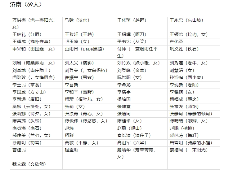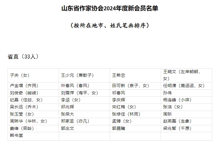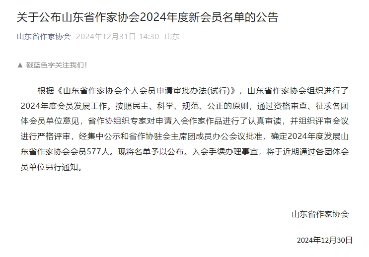 根據《山東省作家協會個人會員申請審批辦法(試行)》,山東省作家協會組織進行了2024年度會員發展工作。按照民主、科學、規范、公正的原則,通過資格審查、征求各團體會員單位意見,省作協組織專家對申請入會作家作品進行了認真審讀,并組織評審會議進行嚴格評審,經集中公示和省作協駐會主席團成員辦公會議批準,確定2024年度發展山東省作家協會會員577人。