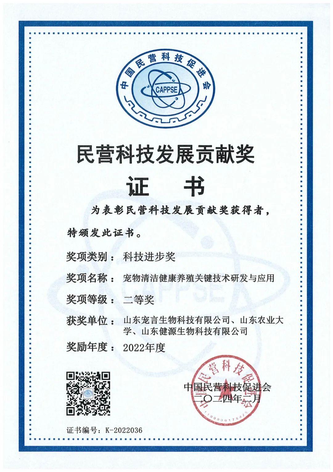 2024-3-9 健源生物榮獲2022年度民營科技發展貢獻獎科技進步獎二等獎