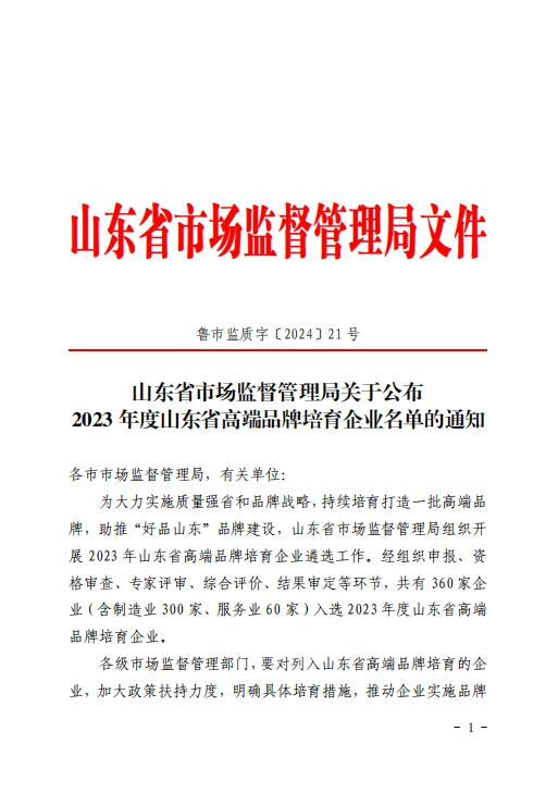 1月26日,山東省市場監督管理局發布《關于公布2023年度山東省高端品牌培育企業名單的通知》,山東健...